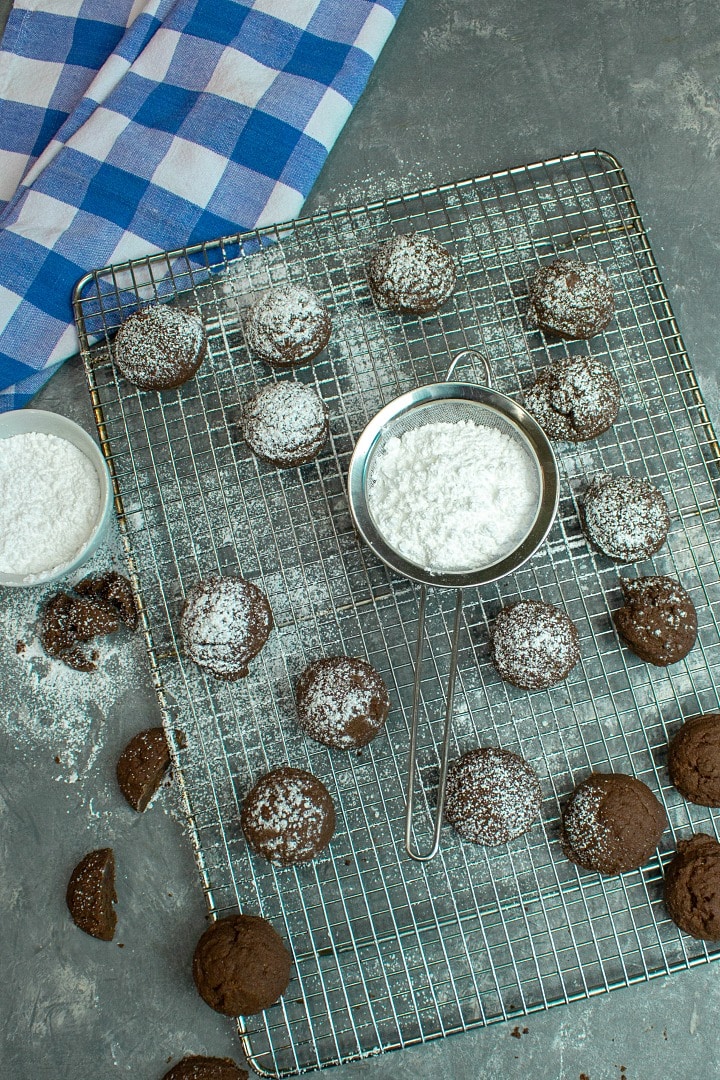 If you are like me, by the end of a recipe I am impatient to see the finished product. After counting down the 10 minutes to cool, I tried to roll a few cookies in powdered sugar. They broke and crumbled in my fingers. So a word from the wise… the cookies are delicate when coming out of the oven and will crumble easily. I recommend sifting the powdered sugar over them first, then waiting until completely cooled to roll in the powdered sugar.