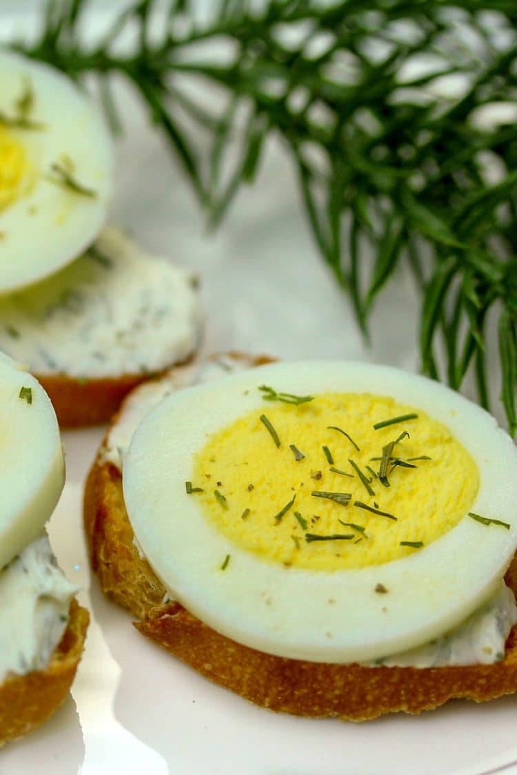 - Spread softened goat cheese on each bread slice (about 1 tablespoon). Top with eggs slice and a sprinkle of dill.