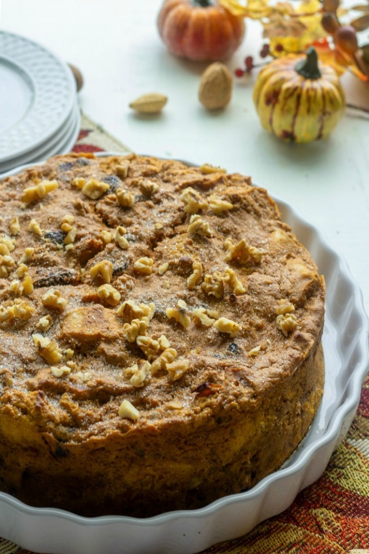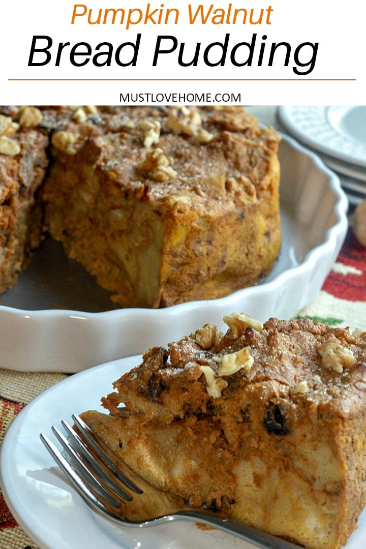 Super Easy Pumpkin Walnut Bread Pudding recipe with pumpkin puree and loaded with walnuts and raisins. Simple to make and perfect for breakfast, brunch or dessert!
