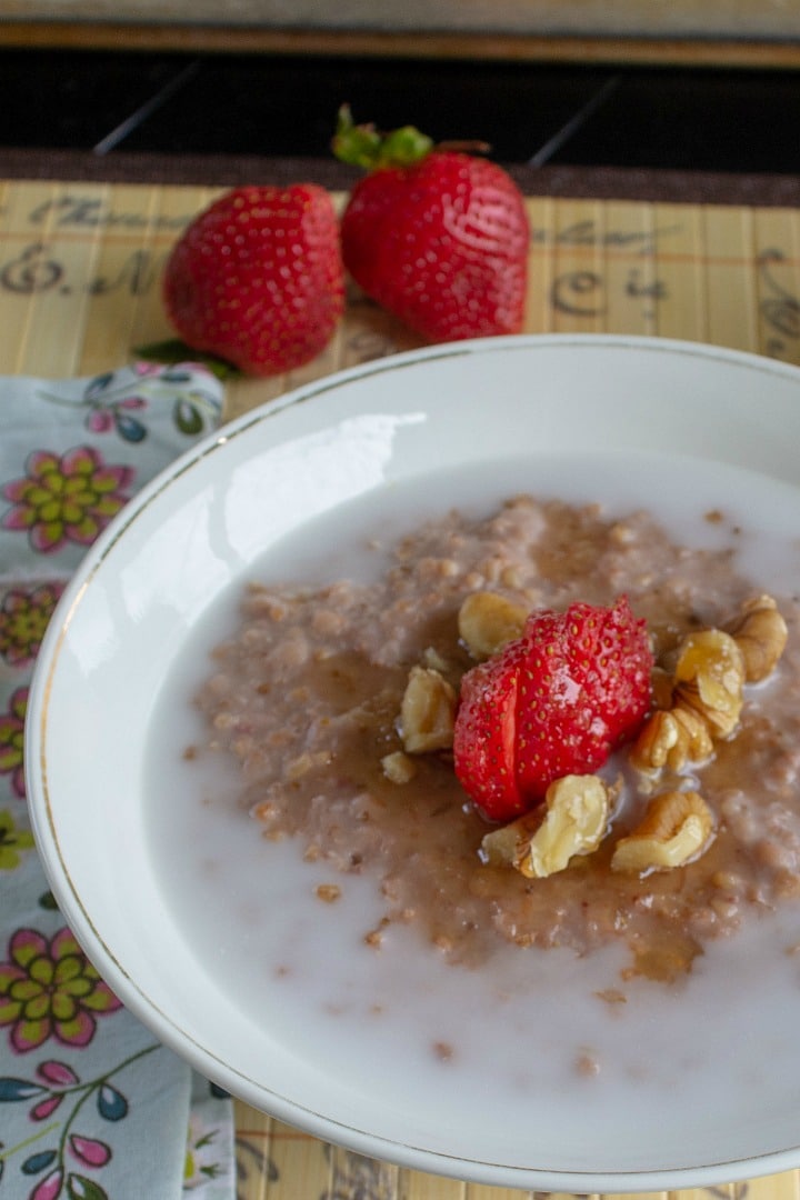 Think oatmeal is bland….have you had steel cut oats? They are definitely worth giving oats another try! The strawberry flavor is not overpowering in this recipe, there is just a hint in the oatmeal itself. And it is sweetened with honey ( I use raw honey) which really compliments the nutty flavor of the oats and doesn’t overpower the subtle strawberry flavor.
