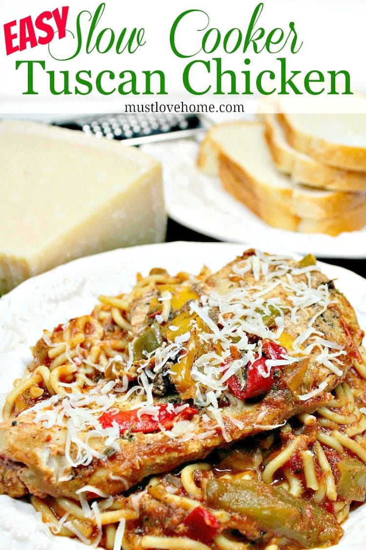 Easy Slow Cooker Tuscan Chicken are chicken breasts seasoned with peppers and herbs, served on a bed of pasta. Everything cooks together, even the pasta!