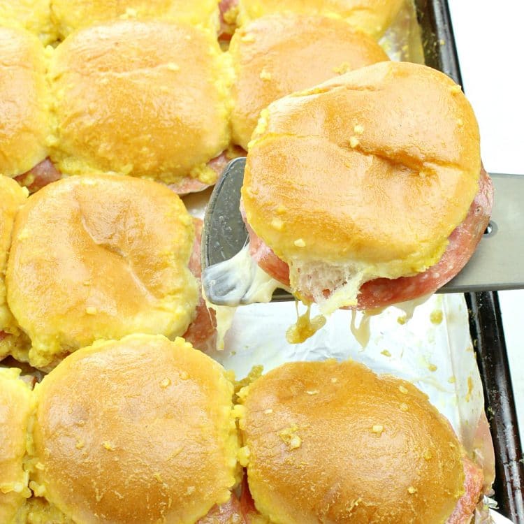 It may be stretching it a little to call these Italian…but with hard salami adding so much flavor, I am going to go ahead and do it!  Deliciously different, these little sliders are a fresh take on the classic ham and Swiss deli sandwich.  Italian Ham and Cheese Sliders have become my go-to, one-pan dish for serving crowds at parties, pot lucks, tailgating, picnics or anytime.