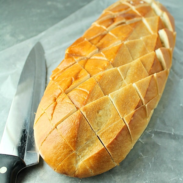 The bread should look like this after you are finished cutting. I like to use my fingers to kind of spread apart the cuts before filling them. It’s a rough job but someone has to do it!
