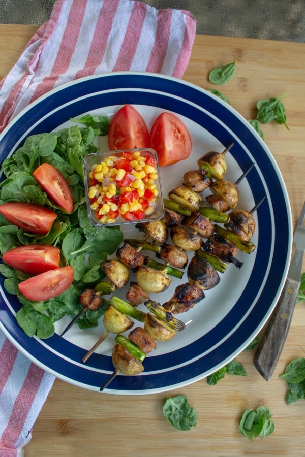 The thing I love most about making shish kebab is how versatile they are. If I have no time, I use smoked sausage, peppers and pineapple chunks that only take minutes to throw together and grill. With time to marinade, these Pork Loin Potato Shish Kebabs are our favorite. The pork loin gets such amazing flavor from the marinade that there is no need to douse them with sauce while grilling. Don’t get me started on how delicious grilled asparagus is. Just too good!