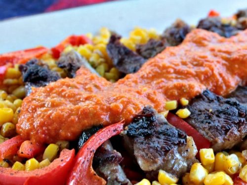 Perfect dinner pan fried skirt steak drenched in a taasty red pepper puree. Served with pan fried peppers, corn and red onion.