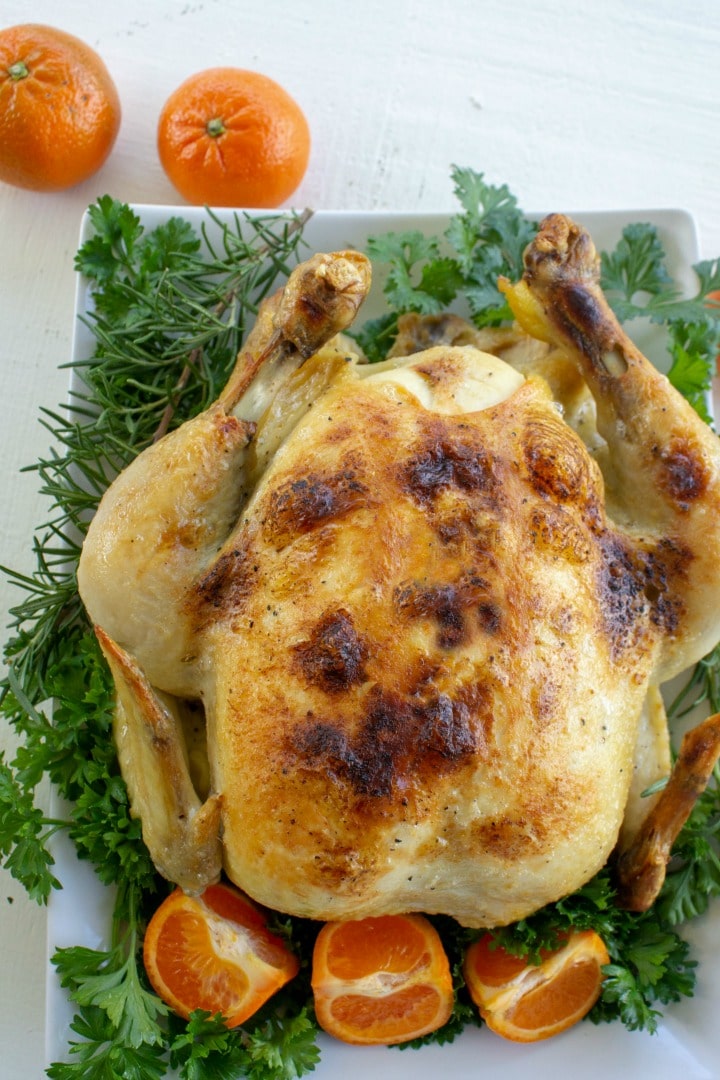 I love serving a whole cooked chicken for dinner. Everyone is happy that they get to choose their favorite pieces…and get to fight over the deliciously crisp skin. It used to be a breeze to do this… pick up a rotisserie chicken at the grocery deli and bring it home to reheat. I changed my ways and now make my own after reading that the store-bought chicken contains preservatives I didn’t want for my family.